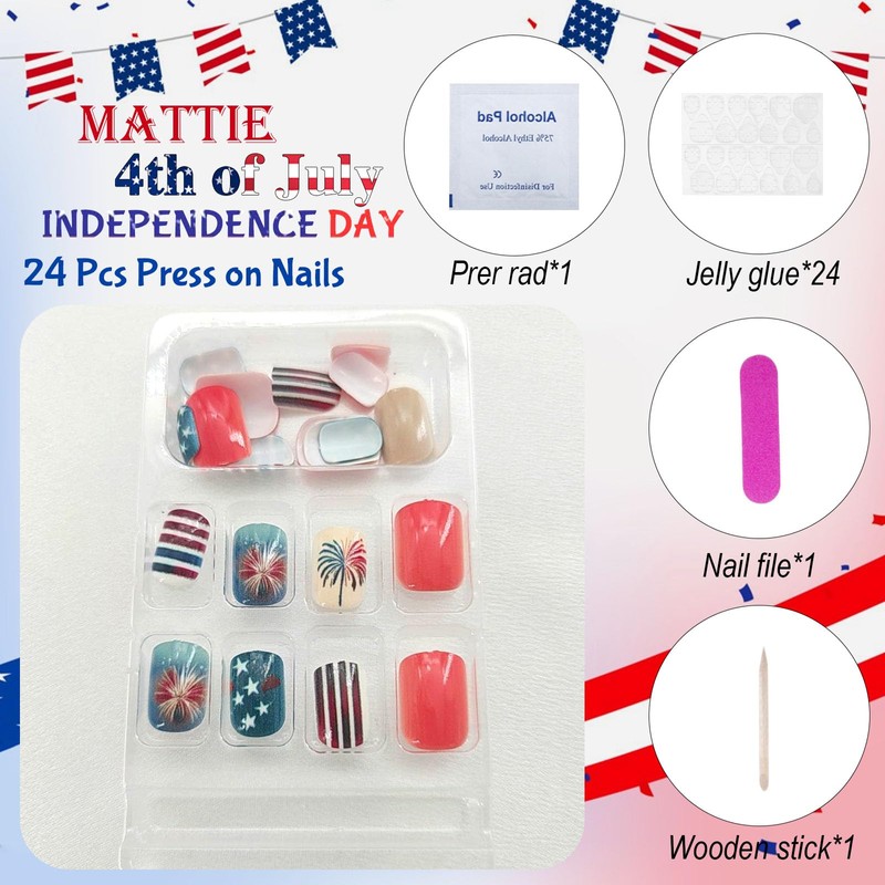 - MAOTTIE Independence day press on nails contains 24 pieces of full coverage nails, 12 different sizes, 1 mini nail file, 24 pieces of jelly glue, 1 alcohol pad, 1 wooden stick. you can choose the most suitable false nails according to the size and width of your nails.