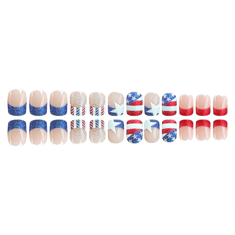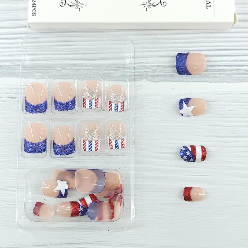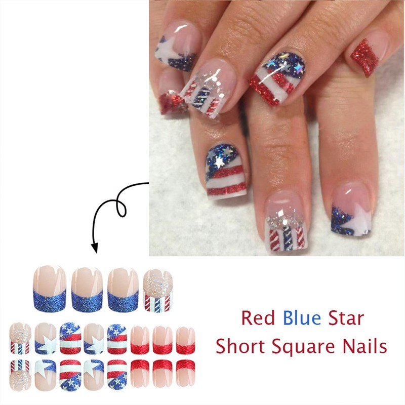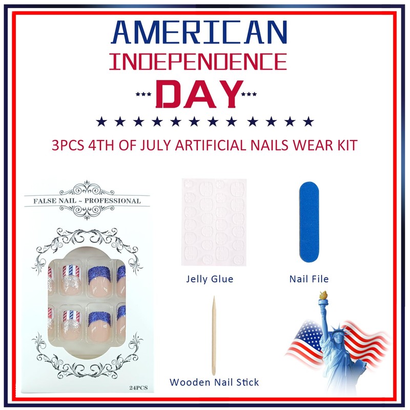 - 4th of July Glue on Nails Kit: Package with 24 pcs short square artificial finger nails, 1 sheets jelly glue stickers, 1pcs nail file, 1pcs wooden stick. 12 sizes fake nails can reusable, suitable for different size of nails