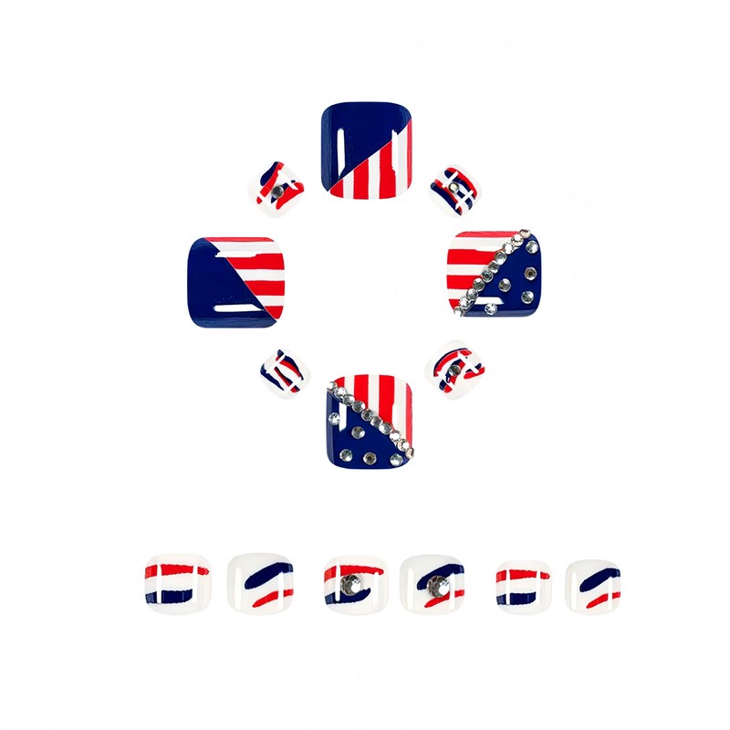 - Package Includes:You will receive 24pcs Independence Day press on toenails, 24pcs double-sided adhesive jelly glue stickers, an alcohol cotton pad,a nail file and a wooden stick for removing toe nail tips. Easy to make a fashion false toenails salon
