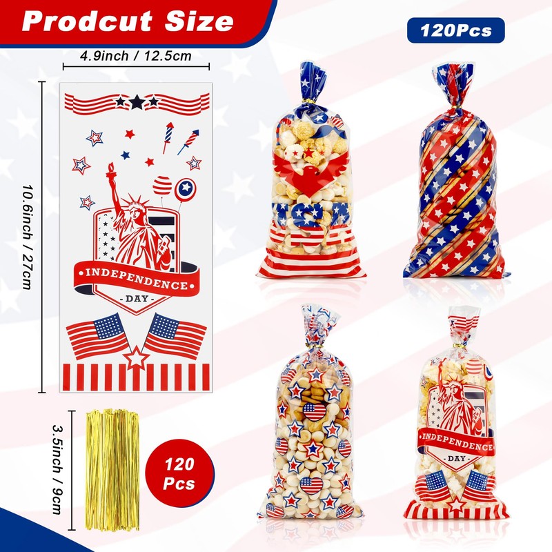 • Great 4th of July Party Favors: You will receive 120 pcs patriotic treat bags in 4 different styles and 120 pieces gold twist ties, each style has 30 pcs 4th of july treat bags. These 4th of july gift bags are ideal for Patriotic Day, Patriotic party favors, Patriotic themed party, veteran party, gathering and more