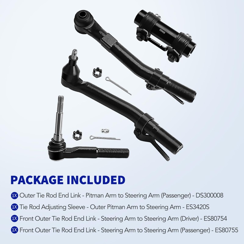 - Package Content: 1x Front Outer Tie Rod End Link -DS300008; 1x Front Tie Rod Adjusting Sleeve -ES3420S; 1x Front Outer Tie Rod End Link Driver -ES80754; 1x Front Outer Tie Rod End Link Passenger -ES80755