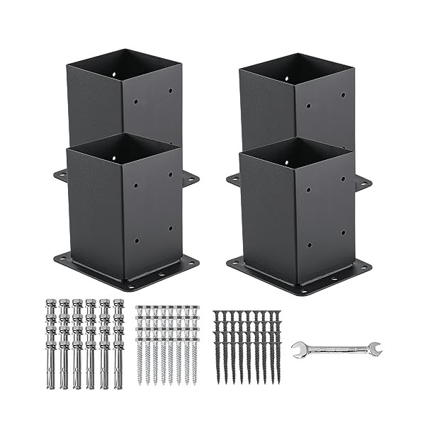 - About this item Material Of 4x4 Post Base: Made of Solid Steel, Black Powder Coated, Rustproof and Strong. Deck Post Base: Used to support porch railings, pergolas, gazebos, fences, deck brackets, post brackets and mailbox post brackets. Unique design: There is a partition at the bottom of the 4x4 post base, which is designed to be completely separated from the ground. Long term use will not cause the wood to rot due to rain. There is a small square box in the middle of base to make it more stable Screws & Anchors Supplied : A wrench. 24 x expansion anchors for concrete floors, 24 socket head wood screws for wood floors, 32 Phillips head self