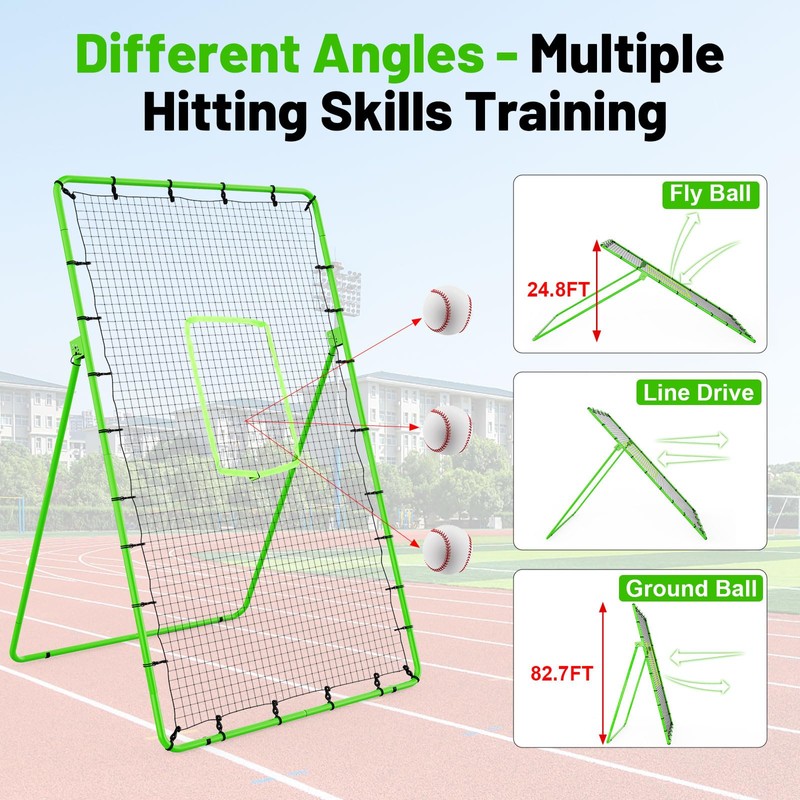- 2.[Multifunction]:The soccer rebounder net has 5 adjustable angles, you can adjust the angle of the pitching net according to your level and training needs at any time. Different angles can be used for practicing baseball, softball, volleyball, soccer, and lacrosse. We also provide you with an adjustable fluorescent green pitching target, which makes it easier for you to see the target and improves hitting accuracy.
