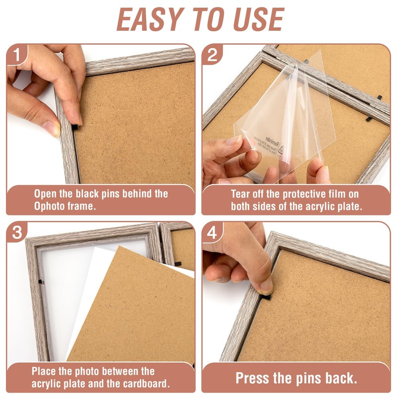 - Folding Design Picture Frames: Simple to load, removable back panels. There are 3 small iron pins pieces on the back of each photo frame. Just use some tool to straighten them to put the photos in. Then pull the small iron piece back, and the photo can be firmly fixed. Please refer to the installation steps shown in the picture for more details.