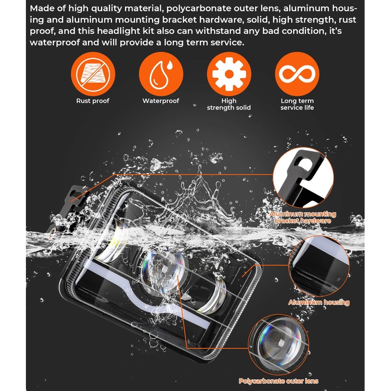 - [HIGH QUALITY MATERIAL] Made of high quality material, polycarbonate outer lens, aluminum housing and aluminum mounting bracket hardware, solid, high strength, rust proof, and this headlight kit also can withstand any bad condition, it’s waterproof and will provide a long term service.