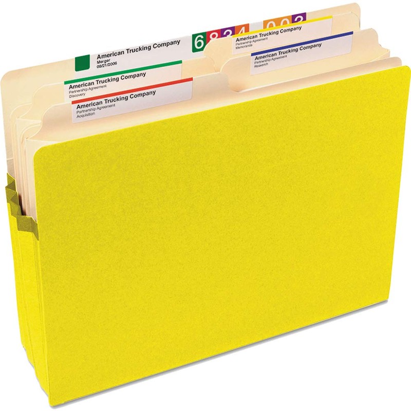 SMD73243 Features: -Package: Includes 10 file pockets.. -Tab Cut: Straight. -Number of Pockets: 1. -Number of File Pockets : 1. -Global Product Type: Expandable File Folders-Top Tab Pocket. -Post-Consumer Recycled Content Percent : 10 %. Product Type: -Expandable Folders. Size: -Letter. Count Per Box: -10-19. Color: -Yellow. Recycled Materials: -Yes. Material: -Manila/Paper & Cover Stock. Dimensions: Overall Height - Top to Bottom: -9.5". Overall Width - Side to Side: -11.75". Overall Product Weight: -1 lbs.