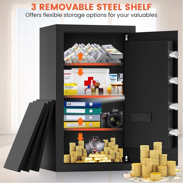 - 🔥🔥🔥【THREE ADJUSTABLE SHELVES】:Our fireproof safe features a adjustable shelf for the organization of valuables Inside. What's more,there is also a Hidden Compartment at the bottom, which add more security for your privacy. The Safe is also equipped with a door basket and some key/jewelry hooks behind the door. All is to ensure the safety of your valuables and documents.
