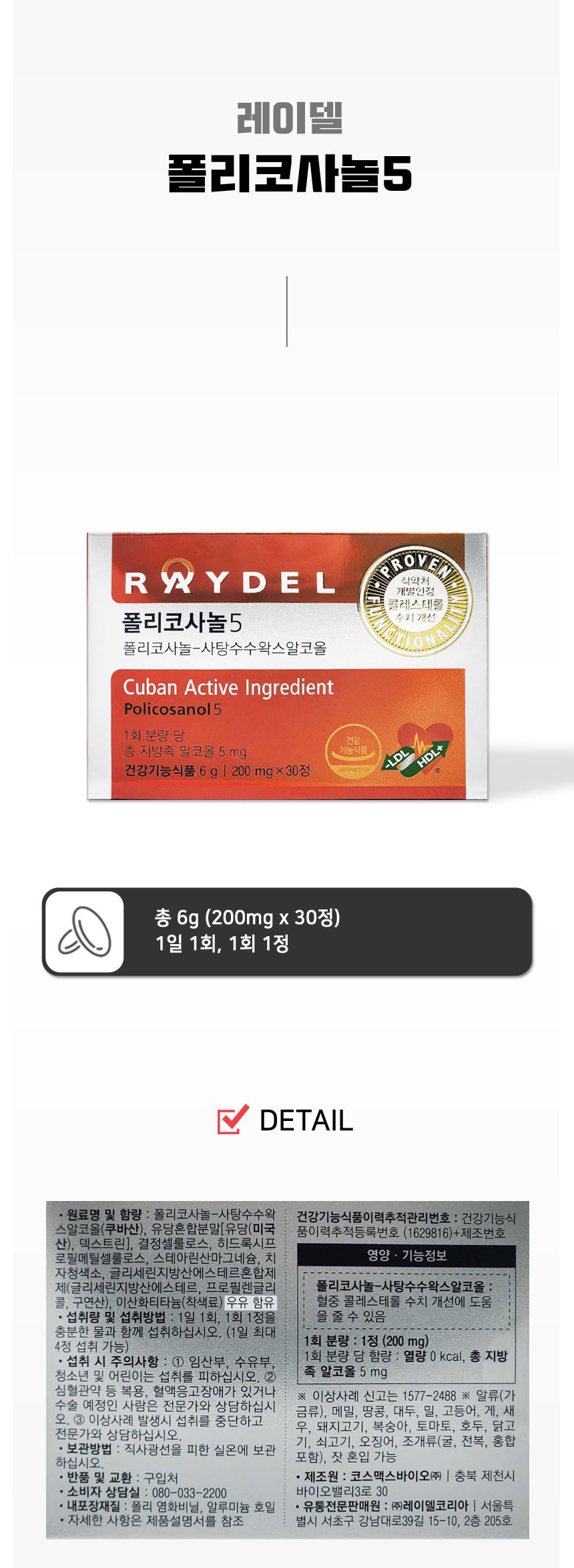 레이델 폴리코사놀5 200mg 30정/mjc Reidel Policosanol 5 200mg 30 Tablets/mjc