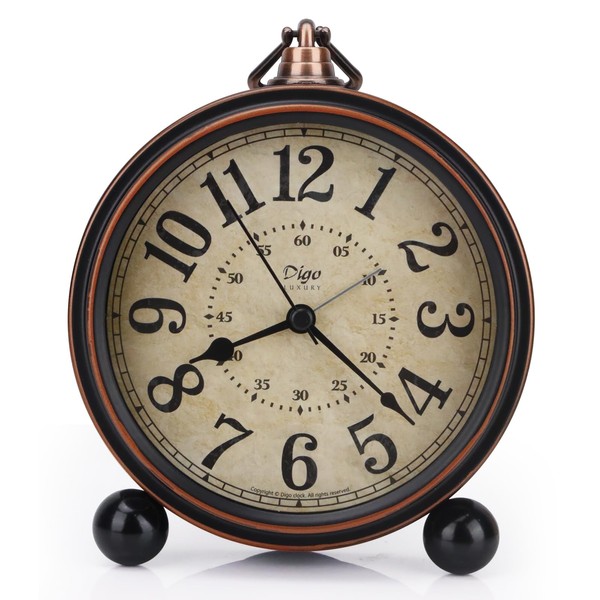 This Silent Table Clock (5.5 Inches) is a stylish designing clock and has several schemes meet all you decoration need. And it has the appearance of the Vintage retro color which brings the breath of art. High-quality Quartz Sweep Movement guarantees accurate time and absolutely silent environment. **Product Features:** Metal frame with golden finish exudes the classical atmosphere. Perfect use in bedroom, kitchen, office, children room, workshop or study. "Non-Ticking", a very low humm at night, so you do not need to worry about the constant ticking of regular clocks when you need some peace and quiet to concentrate on your work or enjoy a full night of undisturbed sleep . Easy to use, easy to read, perfect for kids or seniors **Specifications:** Type: Non-ticking Table Clock Function: Alarm Movement: Smooth Sweeping Quartz Powered by: 1x AA carbon zinc battery (Not included) **Note:** 1\. The two buttons to set time and alarm are designed that way. Please don't mistake the special design for the sign that they're broken or of poor quality. 2\. Pls. Use one AA zinc carbon battery to power the clock, because alkaline battery or rechargeable battery which may damage the clock movement or shorten the life span of it, as well as the time may not be accurate. 3.There are slight difference between the picture and the real item caused by light brightness. **What we offer:** 24-hour response time, 30 day refund guarantee, 12 months guarantee. If there is any problem, please feel free to contact us.