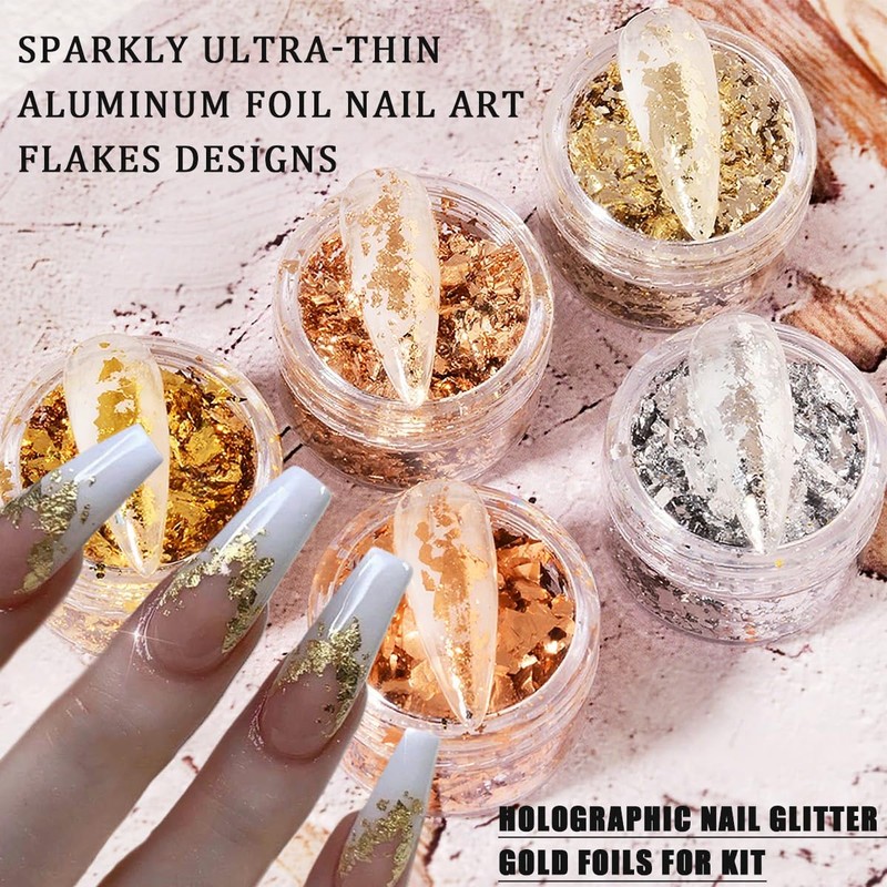 5 Bottles Holographic Nail Glitter Foils, Sparkly Ultra-Thin Aluminum Foil Gold Leaf Flakes for Acrylic Nails, Resin Crafts, DIY Manicure & Art Decorations