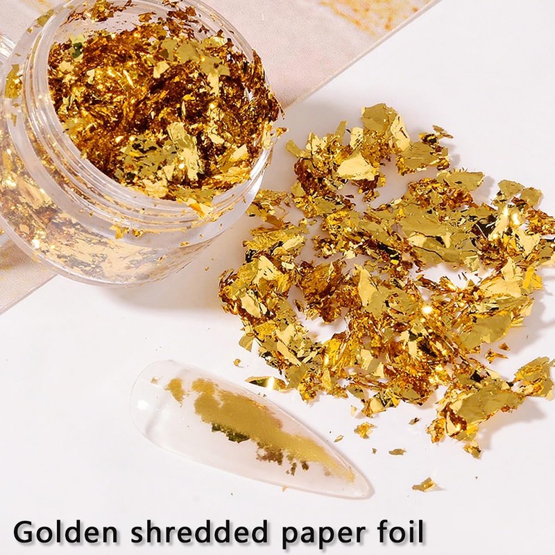 - 【Premium Soft Foil Material】Made from ultra-soft metallic foil that’s easy to tear and press into small pieces, these gold foil flakes blend seamlessly into gel, acrylic, or natural nails.