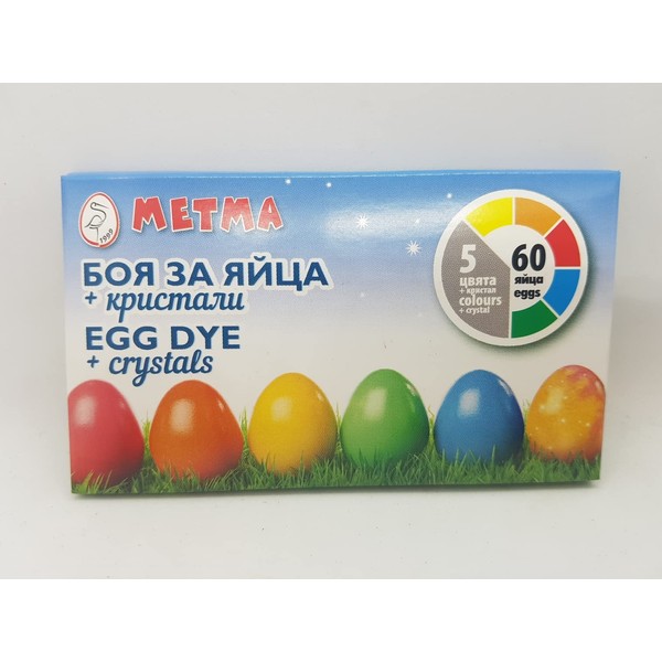 - The package contains: red, yellow, blue, green, orange colors + crystals . For colouring 50 eggs and 10 crystal eggs.