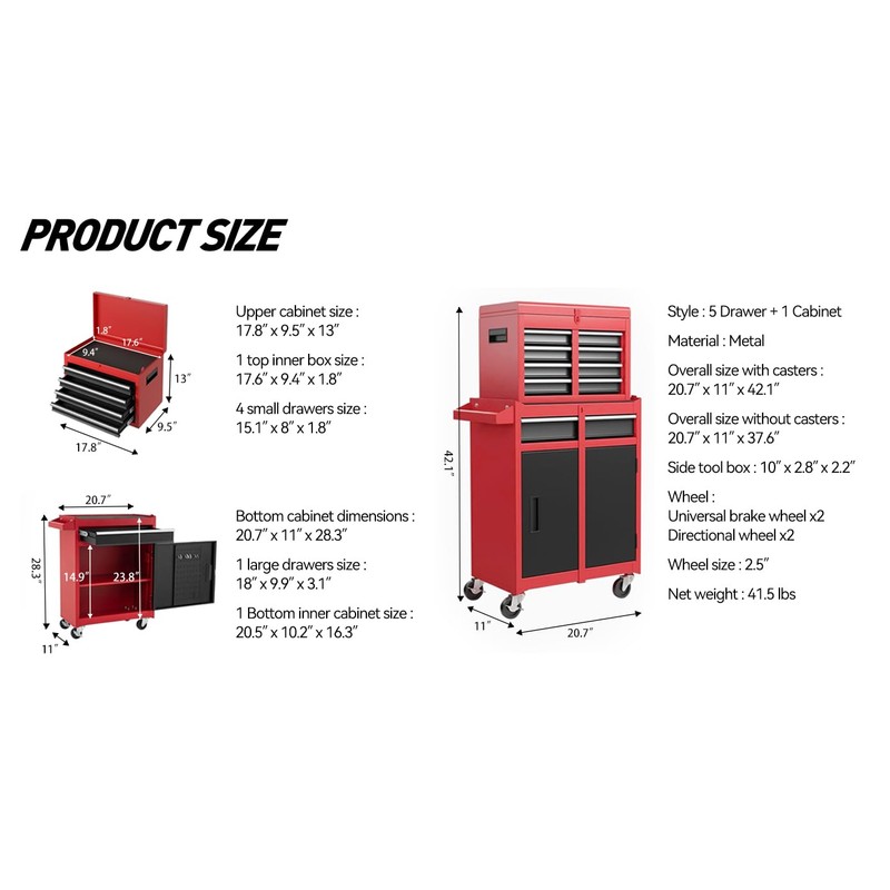 5 Drawer Tool Chest with Wheels, 2-in-1 Detachable Metal Rolling Tool Storage Cabinet, Lockable Wheels, Locking Mechanism, for Garage, Warehouse, Repair Shop, Workshops, Red