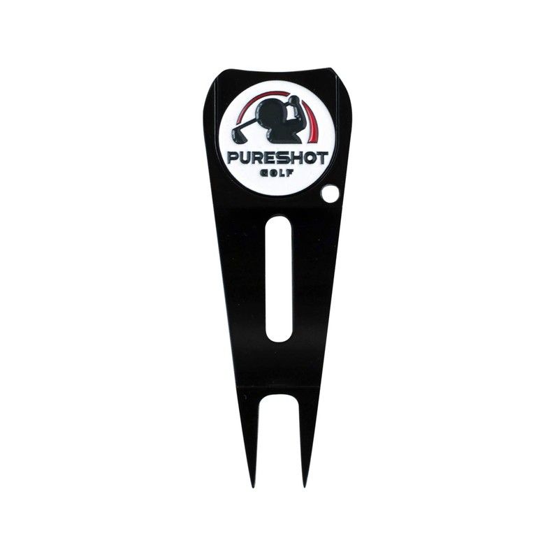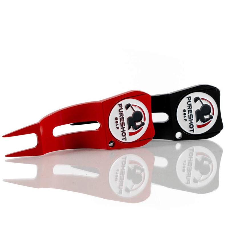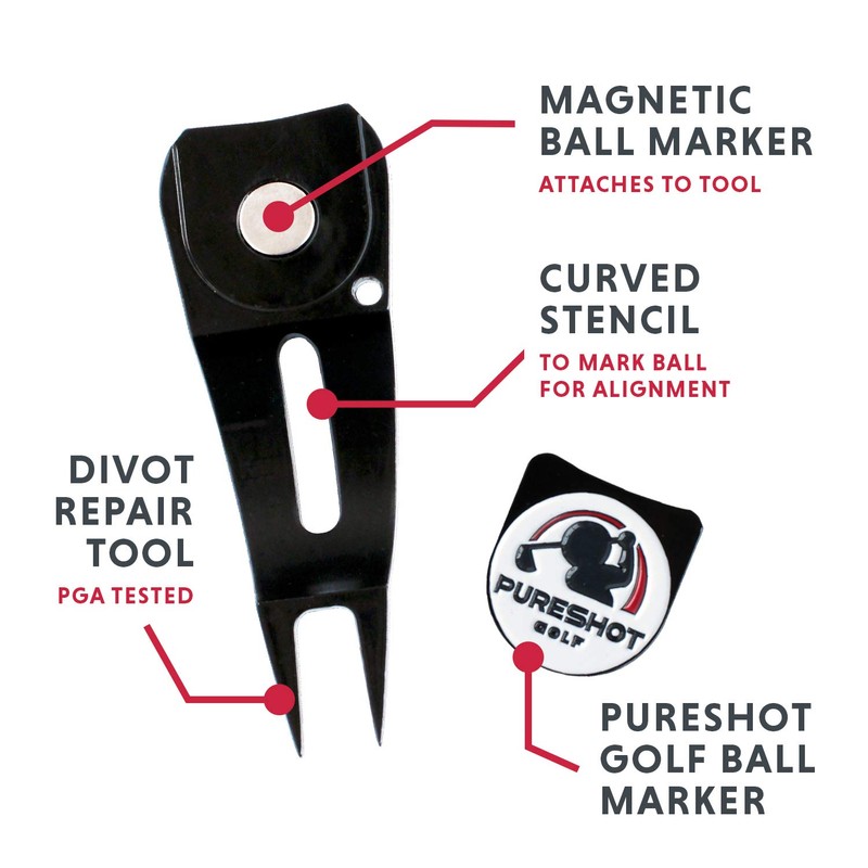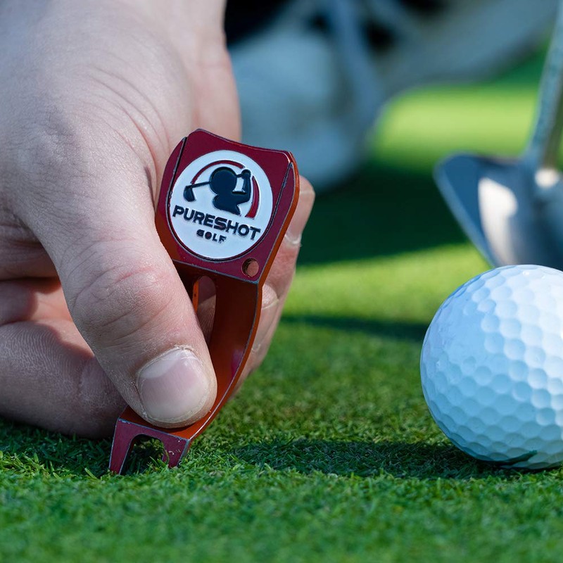 5-in-1 Golf Divot Repair Tool | Golf Ball Line Stencil Putting Alignment | PureShot Ball Marker (Red)