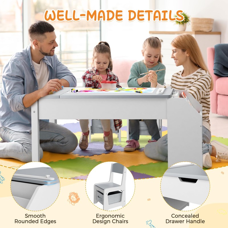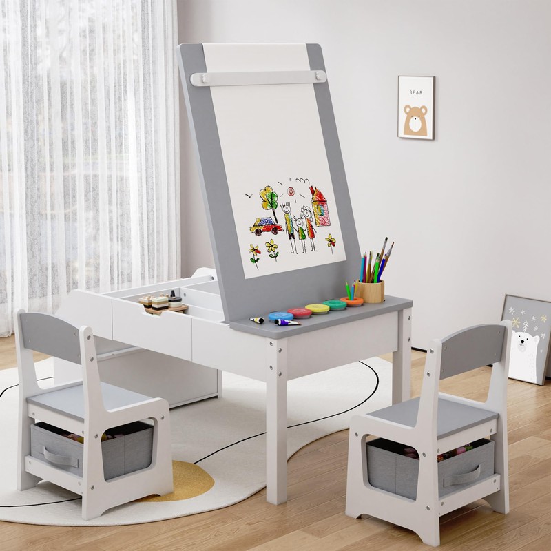 5-in-1 Kids Art Table and Chairs, Toddler Table and Chair Set, Craft Play Desk for Kids, Convertible Art Easel with Paper Roll Holder & Storage Drawers, Children Activity Learning Center-Gray