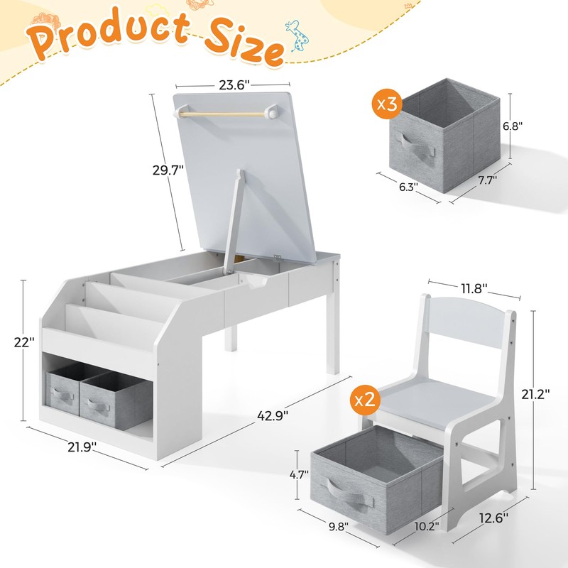 - 5-IN-1 MULTIFUNCTIONAL DESIGN: This kids table and chairs comes with a hidden lift bar that easily converts the table into an art easel. In easel mode, the under-table storage space instantly transforms into a building block area or craft corner. When closed, it transforms back into the ideal teaching/study toddler desk for kids. With a large 42.9“ L x 22” W tabletop, it provides ample space for parent-child guidance or activities, and is perfect as an art table, game table or dining table.