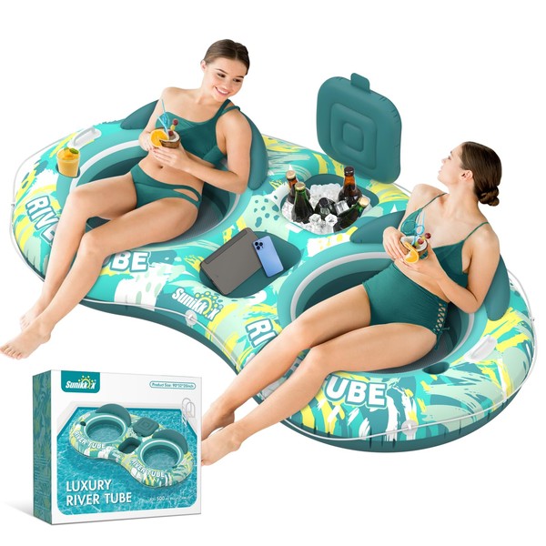 Sunikko X 5-in-1 Pool Floats Adult Heavy Duty River Tube, 2 Person Water Lounge with Backrests, Built-in Cooler, Cup Holders, Deluxe Pool Float for Summer Relaxation