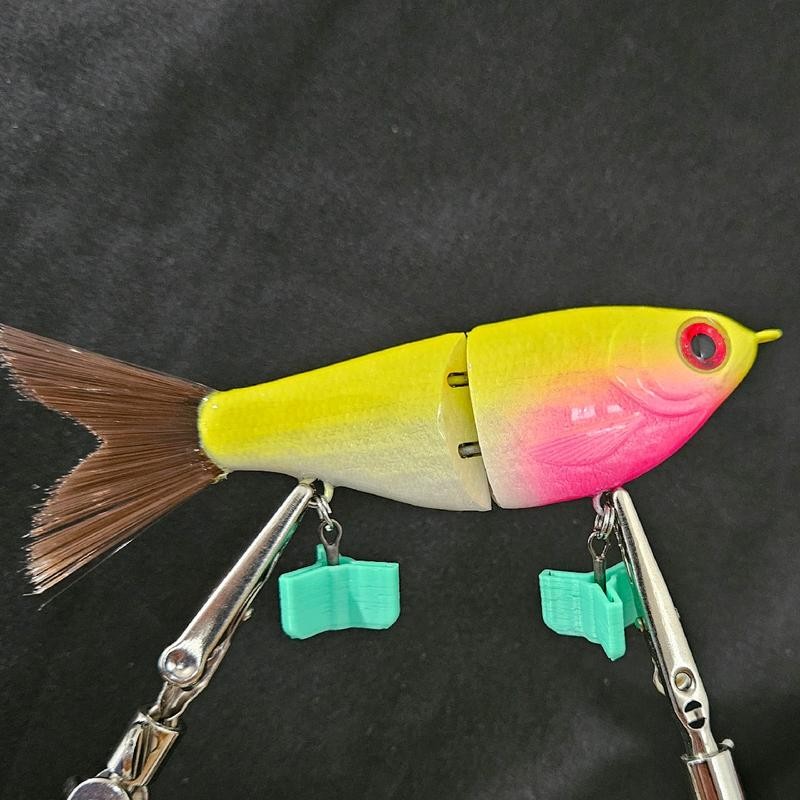 5" Glide bait. Equipped with a brush tail and #6 VMC treble hooks. 5 inches from nose to the tip of the tail. 1/2 OZ.