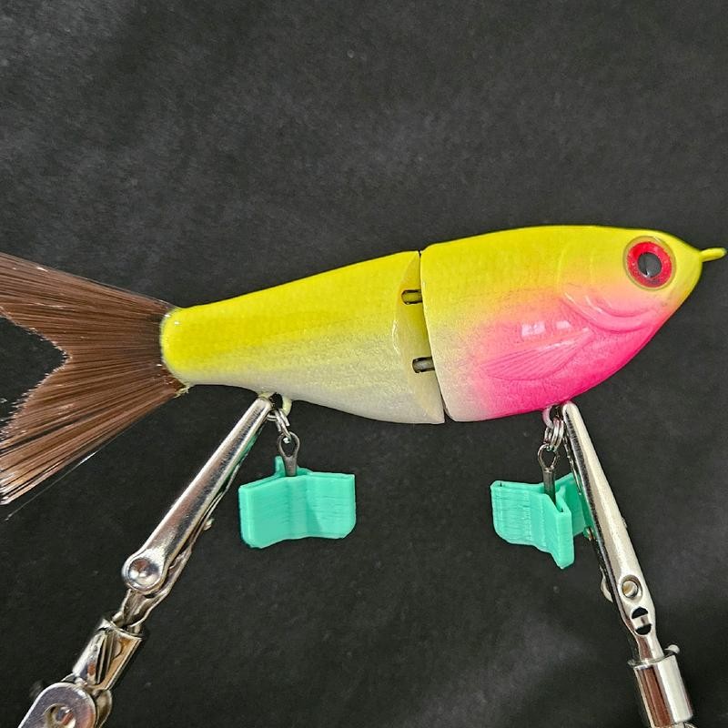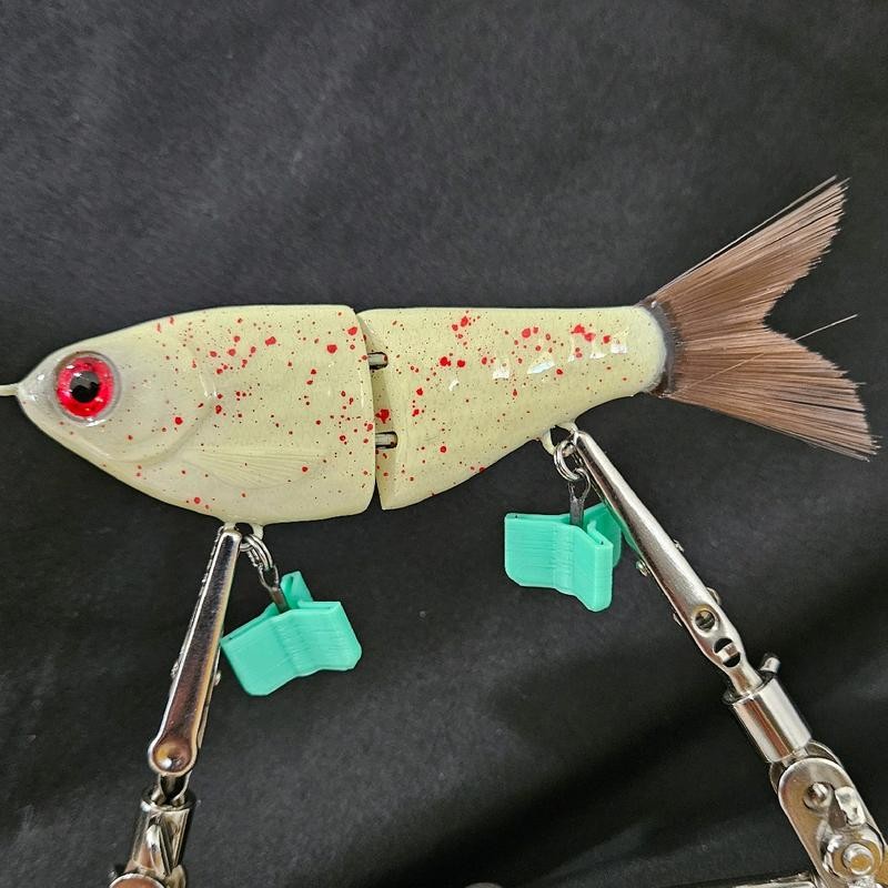 5" Glide bait. Equipped with a brush tail and #6 VMC treble hooks. 5 inches from nose to the tip of the tail. 1/2 OZ.