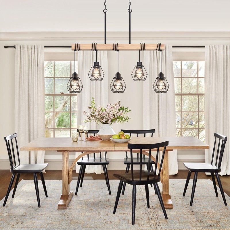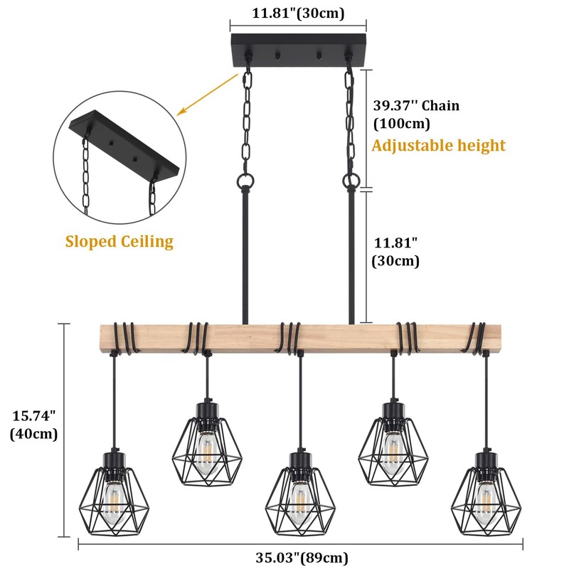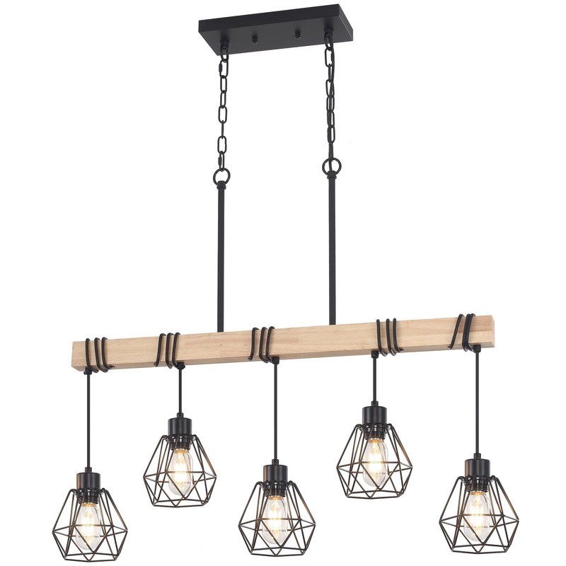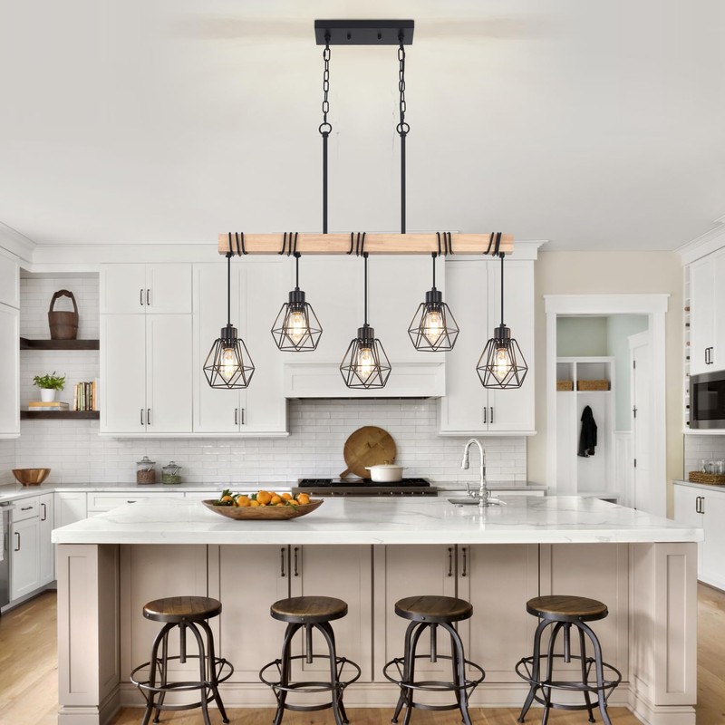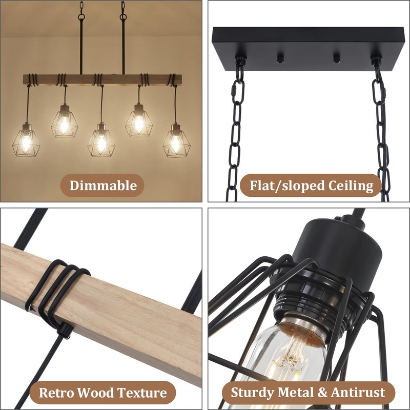 - 【Wood Island Light】This 5-light kitchen island light is crafted from high-quality solid wood, showcasing natural wood grain that ensures durability. Paired with a sleek, minimalist metal shade, create a unique interplay of light and shadow. Bringing individual industrial farmhouse style to your home, making it an ideal choice for both kitchen islands and dining rooms.