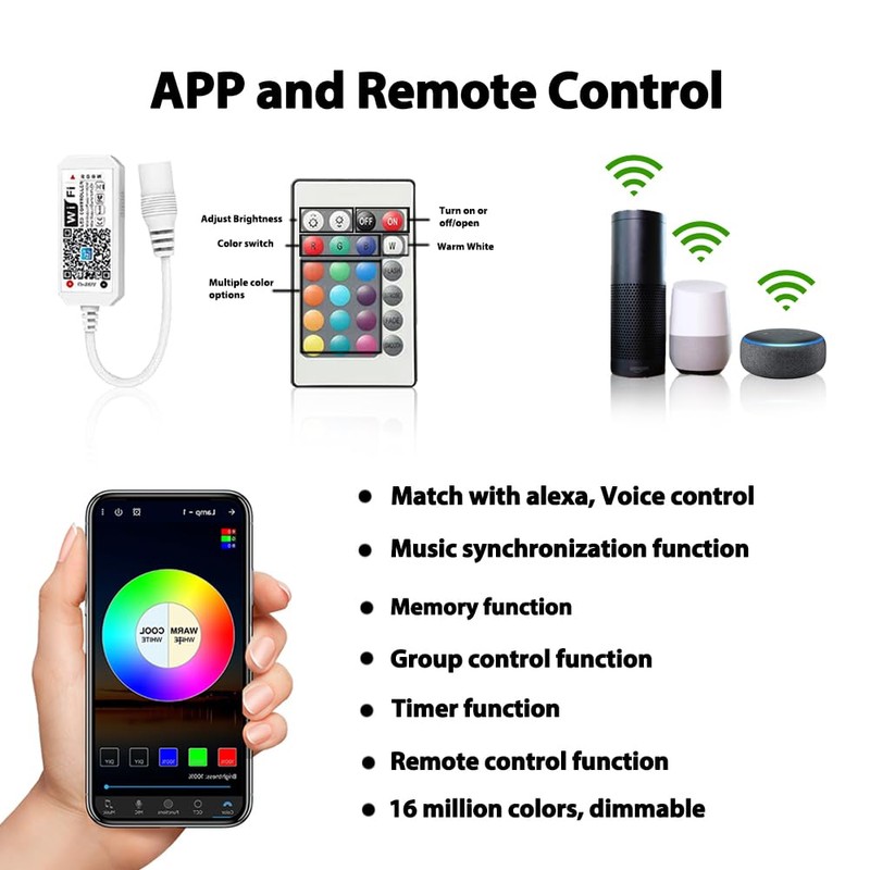- With remote control: the LED strip light compatible with Alexa, Google Home. Control your LED stripes by voice with Alexa (in WiFi mode). e.g. "Alexa, turn on the bedroom light chain". You can control your LED strip light via app (Magic Home), free your hands. The LED strip is equipped with a remote control, and you can also use the remote control to control the colour, brightness and mode of the light.