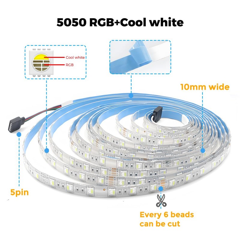 - RGB + cool white LED strip: RGBWW 4-in-1 24 V LED strip 5 m, 15 W/m. The LED strip provides 16 million colors and cool white, the brightness ranges from 1% to 100%, and the app provides music function, timing function and other modes. You can set your favourite colour and change the style according to your wishes. Only work in a 2.4 G network, unsupported 5G network