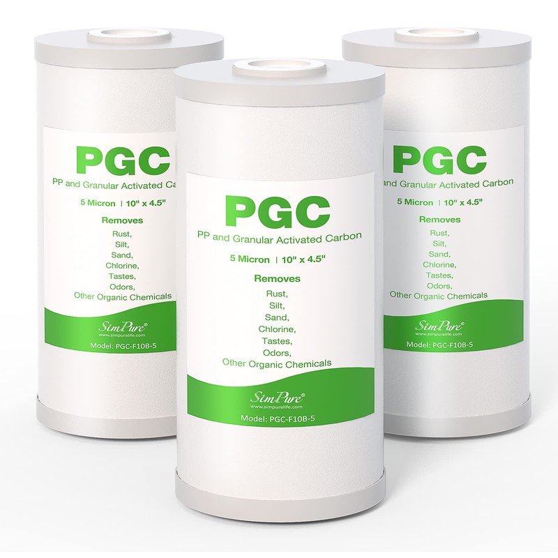- Efficient Filtration - SimPure whole house sediment and activated carbon water filters combine two filtration functions, The PP melt-blown can effectively carry out primary filtration of raw water to remove sediment, rust, impurities, colloids, and suspended solids; The granular active carbon can effectively adsorb the residual chlorine, hydrogen sulfide, water-soluble heavy metals, heterochromatic odor, etc; Premium material offers you clean and refreshing water.