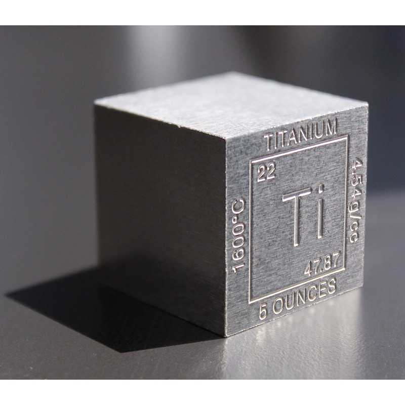 A fun way to diversify your collection with this 5 ounce Titanium cube paperweight. Its industrial finish is complemented by a creative design featuring unique elements to the titanium atom, including titanium’s atomic symbol (Ti), atomic number (22), atomic mass (47.87), and the "Melting Point 1600°, Density 4.54 g/cc, 5 ounces, Titanium”.