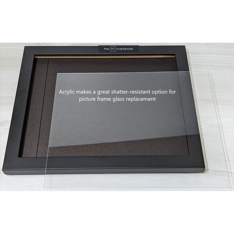 - DURABLE & SHATTER RESISTANT - Acrylic is light weight, more durable and much harder to break than glass, making it an ideal glass replacement for picture frames. Laser cut for smooth edges. Thickness is 1 mm = 0.04 inch = 1/32 inch (approx.)
