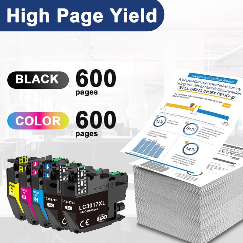 - High Yield - 550pages per LC3017 black ink cartridge and 550pages for LC3017 color ink cartridge High Yield Ink Cartridge (Letter/A4, at 5% Coverage).