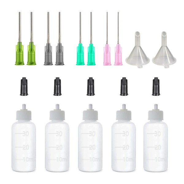 5 Pack Applicator Bottle with Blunt Needle Tip - 30ml Squeezable Dropper Bottles, Storage Caps, 14ga Needle Tips and Mini Funnel, Use for Glue Applications, Precision Oiler, Lab Dispensing