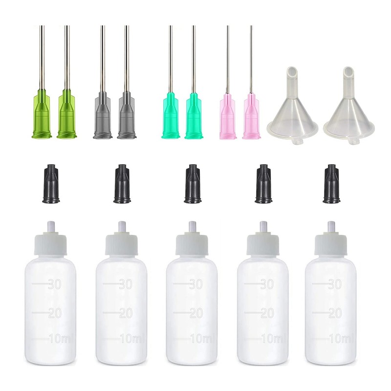 - 30 ML BOTTLES (1 oz.): needle tool, paper crafting, card making, alcohol inks, or other thin liquids. Empty glue bottles are a great addition to your fine art supplies. Needle tip bottles for needle art.