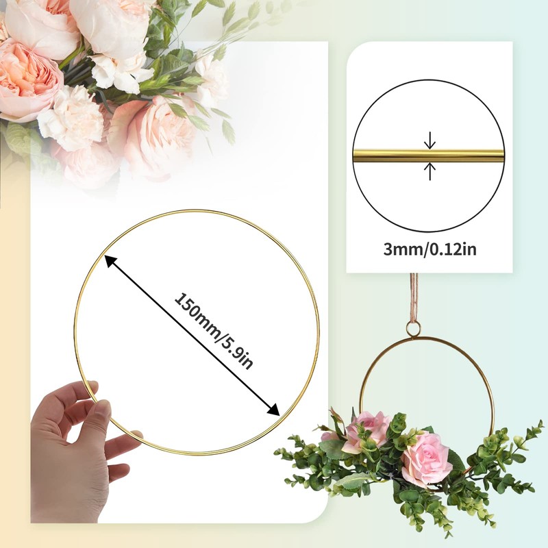 - 【Suitable Size】: The size of this metal 6 inch hoop is very suitable, its diameter is about 150 mm, the thickness of the ring is 3 mm, not too big and not too small, enough to meet your daily decorative use, you can use the rope to wrap the metal wreath ring with beads, feathers, tassels, and other accessories to make your favorite crafts.