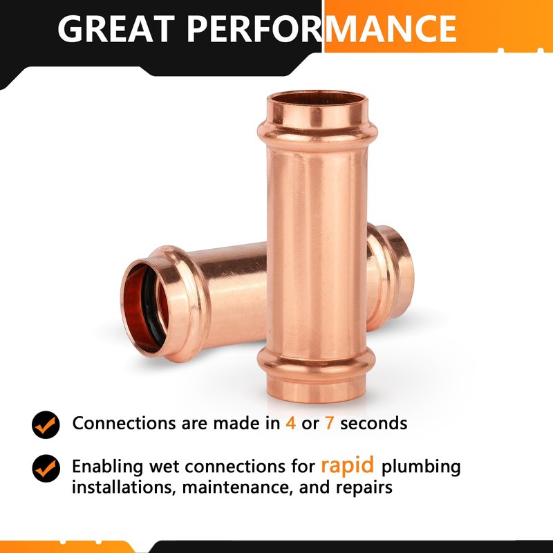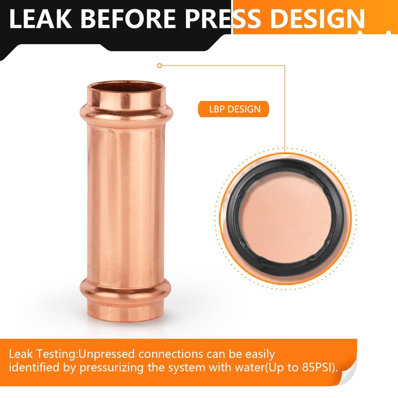- PACKAGE INCLUDE-5 pack 1" copper press extened coupling without stop, for type M,L or K copper tubing. Safe for Potable Water.