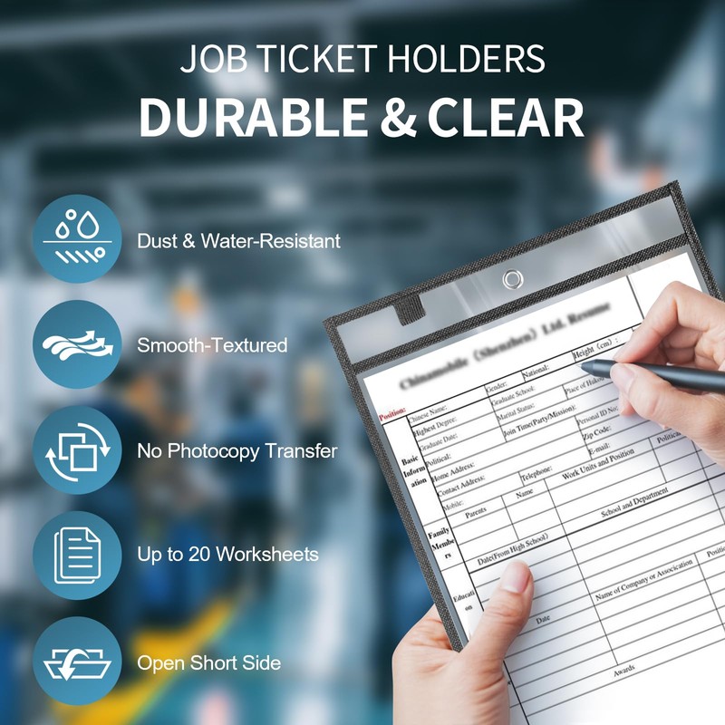 - Convenient job ticket holders 9x12 - The inside size of job ticket holder is 9x12 in. Simply insert & remove up to 20 sheets in plastic ticket sleeves. Work order holder opens on short side, has a convenient eyelet at the top for handing