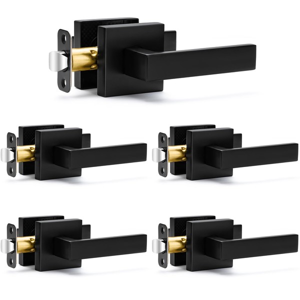 5 Pack Passage Door Handles Matte Black Door Knobs, Interior Door Knobs Square Heavy Duty Non-Locking Handlesets Hall Closet Handles, Reversible for Right & Left Sided Doors