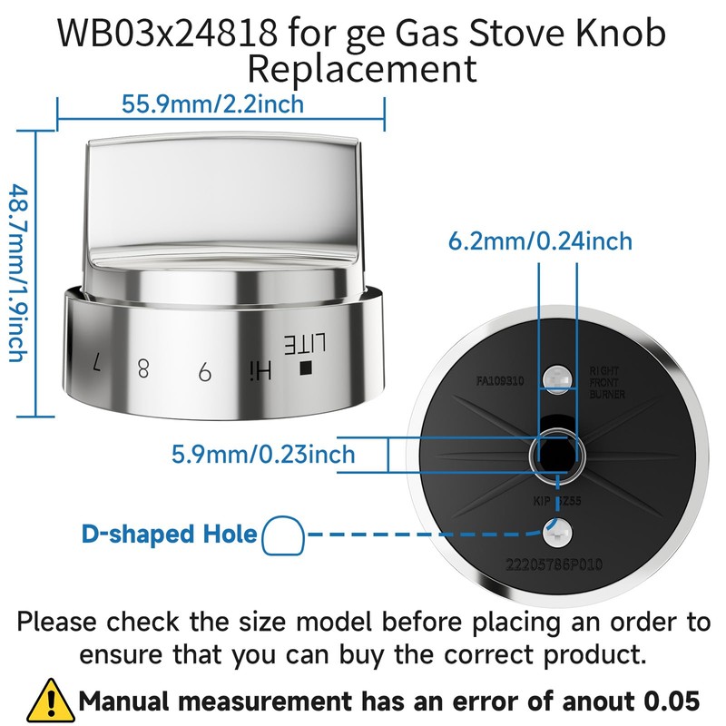 - [PRODUCT SPECIFICATIONS] Package contains 5 packages of for ge stove knobs replacements. NOTE: The WB03X24818 burner stove knobs mounting hole (D-axis size) is 0.22 in. to 0.25 in. The D-shaped hole is approximately 0.59 in./15 mm deep and 0.2 in. in diameter. This knob is boldly marked OFF, Lo, 1, 2, 3, 4, 5, 6, 7, 8, 9, Hi and LITE, check model number and hole size before purchasing. (See pictures for details)
