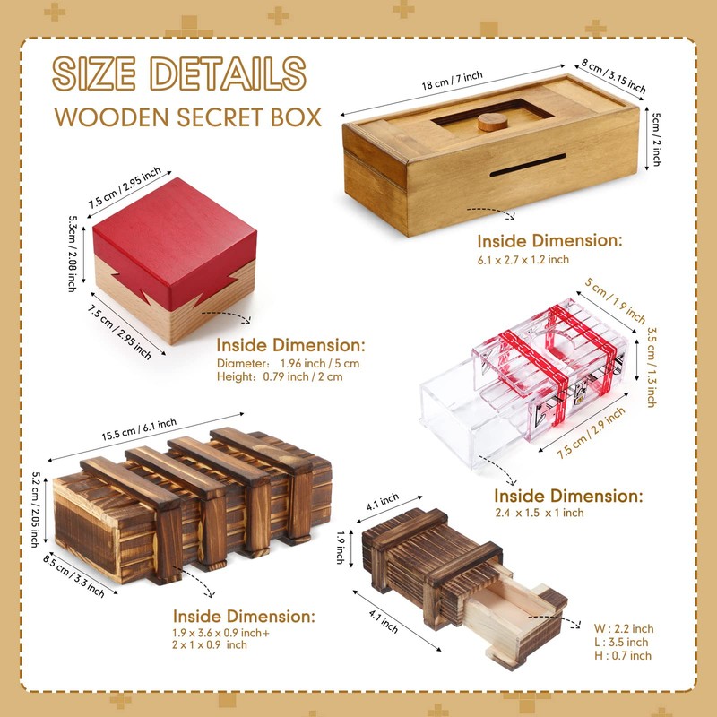 - Detailed Product Information: the puzzle box is made of quality wood material, which is strong and sturdy, not easy to break or deform, serving you for a long time; Each box has a varied size, namely 15.5 x 8.4 x 5 cm/ 6.1 x 3.3 x 2 inches, 18 x 8 x 4.8 cm/ 7 x 3.1 x 1.9 inches, 10.5 x 6.5 x 4.3 cm/ 4.13 x 2.56 x 1.69 inch, 7.5 x 7.5 x 3.5 cm/ 2.95 x 2.95 x 1.38 inches and 7.5 x 7.5 x 5.1 cm/ 3 x 3 x 2 inches, can be applied to preserve your secrets, cards, jewelries, and more