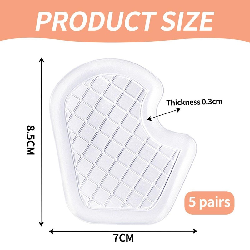 - 【Product Content】 You Will Receive 5 Pairs Of Transparent Forefoot Pads, Each Pair Is 7*8.5Cm In Size. This Forefoot Pad Is Made Of Transparent Silicone Material, Has A Soft And Comfortable Design, And Is Effectively Anti-Slip And Anti-Wear. It Is A Must-Have In Daily Shoe Accessories.