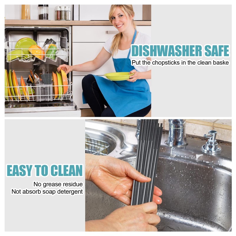 • Easy to Clean:Buy once and can be used for years to come. These reusable chopsticks are resistant to high temperatures and can be placed in the dishwasher and disinfection cabinet, they won’t bend, melt, or crack, It completely solves the problem of cleaning after meals. Fiberglass material and Seamless design, make it doesn’t absorb food residue, or soapy residue, it will be very clean and no residual dirt and oil stains left even if it is washed by hand.