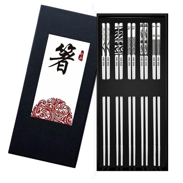 5 Pairs Reusable Chopsticks, Stainless Steel Chop Sticks Silver Dishwasher Safe Metal Delicate Japanese Chinese Korean Chopsticks w/ Pattern Kitchen & Dining