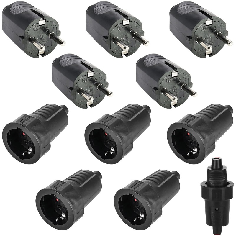 - Rubber Schuko coupling set includes: 5 Euro plugs made of plastic, 5 protective contact sockets made of plastic. Schuko plug coupling rated voltage: 250 V, rated current: 16 A, waterproof according to IP54, 2-pin, outdoor waterproof black Schuko plug and rubber coupling without cable.