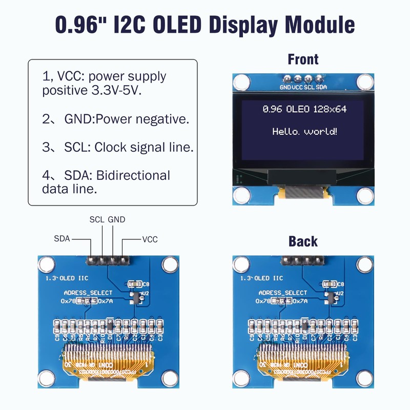 - 【SSD1306】Supports I2C/IIC interface, IIC address can be changed, convenient for use with different machines Four square holes for easy installation, convenient for seamless connection with Arduino screen , Raspberry pi accessories and other microcontrollers.