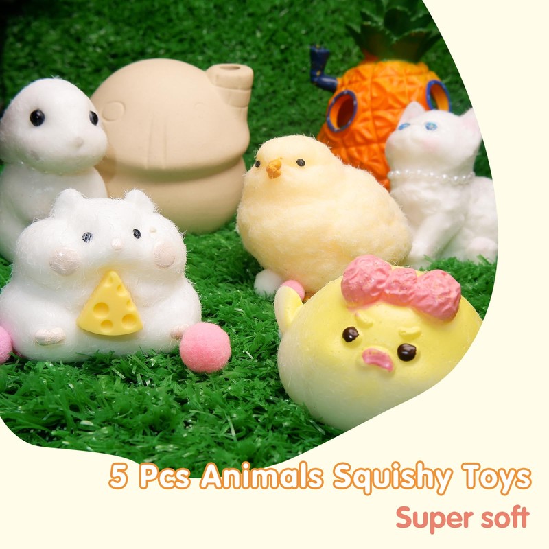 5 Pcs Animals Taba Squishy Toys, Stress Relief Squishies Fidget Toys with Hamster, Chick, Cat, Pufferfish & Bunny for Party Favors OPP Packaging