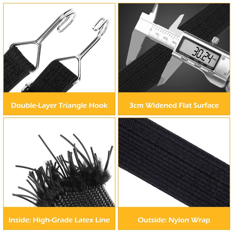 • 🛡️【Wide Flat Design, Stable and Non-Slip】The 3 cm width increases the force-bearing surface, which is more stable than the round elastic rope, effectively avoiding sliding, denting or cutting the goods. The widened flat design better protects your items and improves safety during transportation.