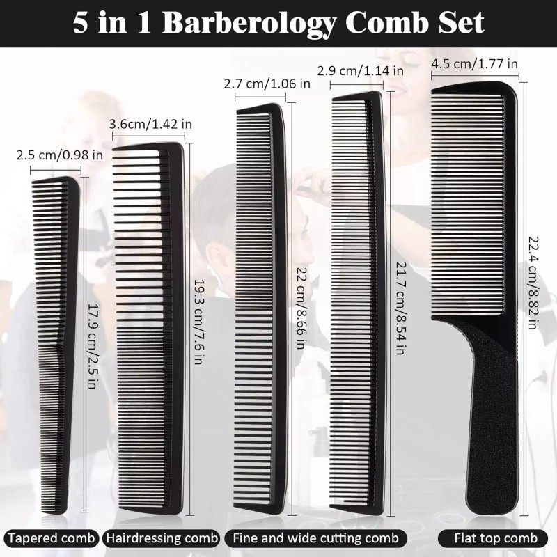 - Nice combination: 5 pieces barberology comb set, including 1 tapered comb, 2 fine and wide tooth hair barber comb, 1 hairdressing comb and 1 flat top comb, rich styles and enough quantity to meet most of your styling needs
