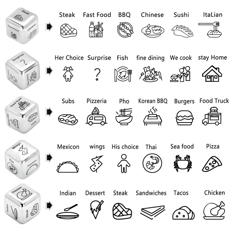 - 【Couple Anniversary Gifts for Her Him】- Funny dice engrave six options for the couples to decide what to eat, including: “Fast food, Steakhouse, Mexican, Sushi, Chinese, Seafood etc.