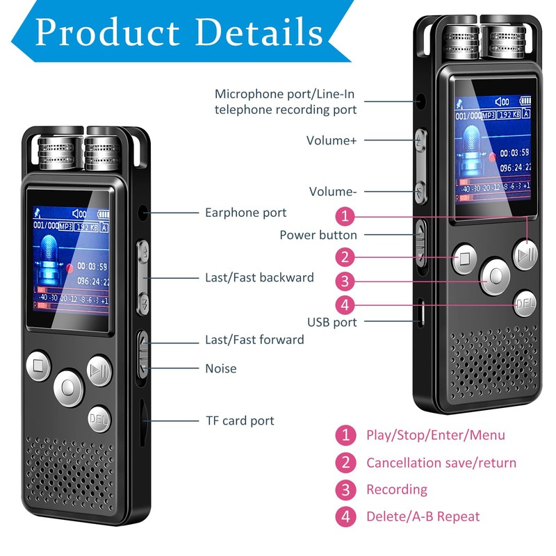 - Clear Voice Recording: the noise reduction technology of portable audio recorder is applied to filter ambient noise, with clear recording to restore the real scene, and the sensitive microphone can help you capture the speaker's words in classrooms, interviews, lectures, conferences and other occasions