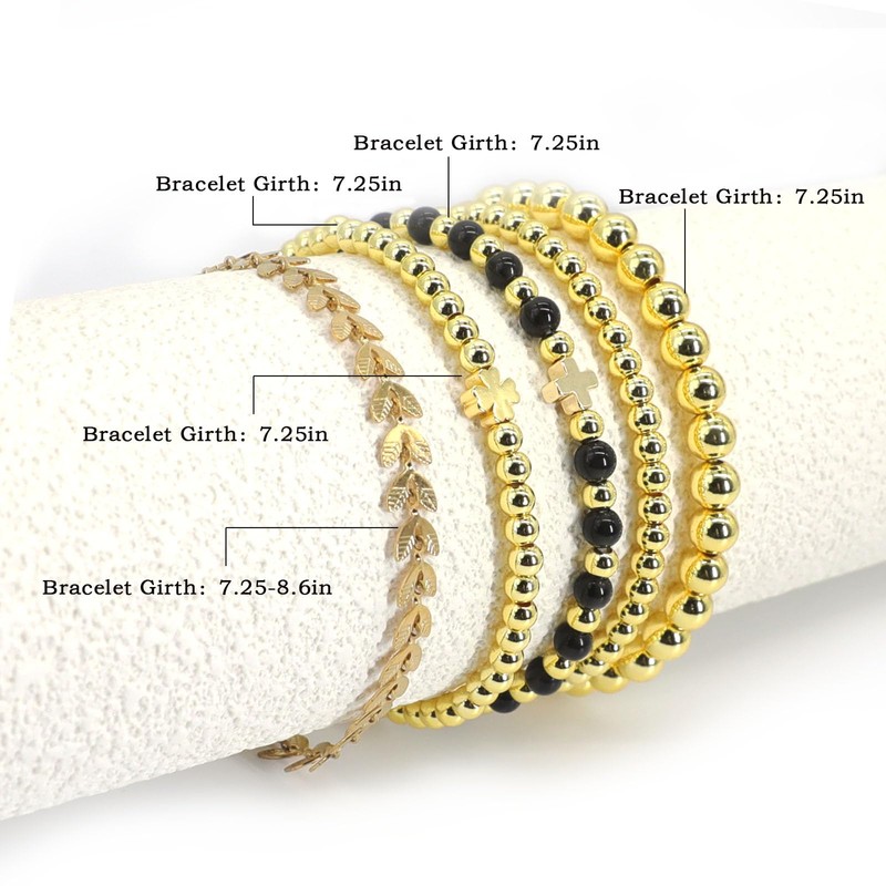 - Stylish Gold Beaded Bracelet Set: This 5PCS gold bracelets set for women features various styles, including gold leaf bracelet, 4mm obsidian gold beaded cross bracelet, 4mm gold four-leaf clover bracelet, 4mm gold beaded bracelet, 6mm cross gold beaded bracelet. Each gold beaded bracelet can be worn individually or stacked with other gold stackable bracelets, allowing you to effortlessly showcase your personal style.