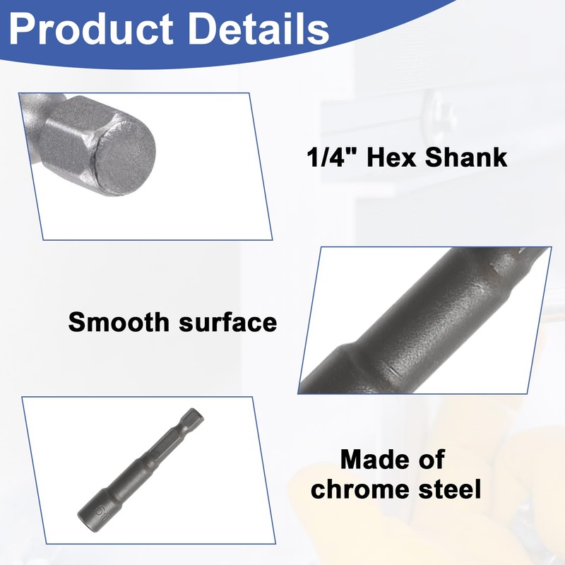 - [Impact Socket Set] 1/4 inch Hex Shank: The nut driver bit set works with cordless drill, electric screwdriver, manual rachet handle, fit into standard 6.35mm drill chucks, but not suitable for heavy use on impact driver, impact gun